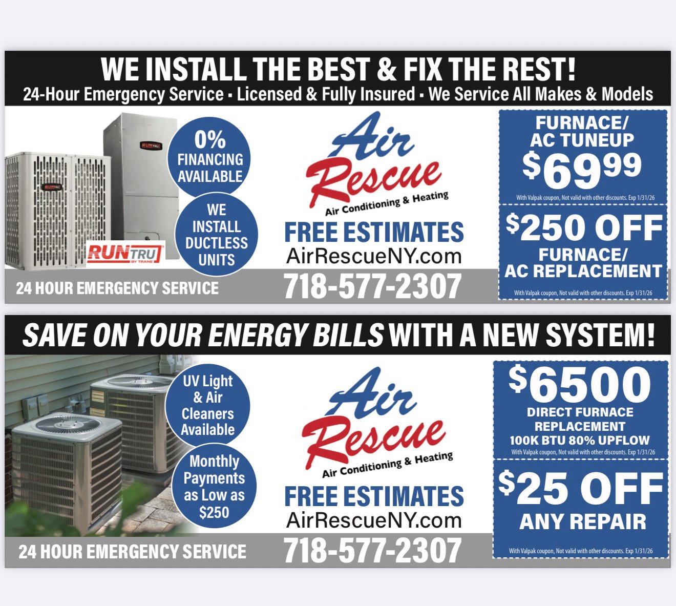 When it comes to experience, Air Rescue Air Conditioning and Heating has an extensive amount to offer. Over the years, we’ve performed Heating and Air Conditioning Installations and Repairs throughout New York City and the Tri-State. Our team of expert technicians continue to employ the latest in heating, ventilation, and air conditioning (HVAC) technology. You can count on us to get the job done right the first time! Air Rescue Air Conditioning and Heating specialize in central air conditioning repair, furnace repair, heating and HVAC services of every size and type of home or business in Staten Island, New York City, Brooklyn, and parts of New Jersey. So, whether you are building a new home, remodeling, replacing your heating and air conditioning system, Air Rescue can give you the most efficient, reliable and durable products for your home or business.